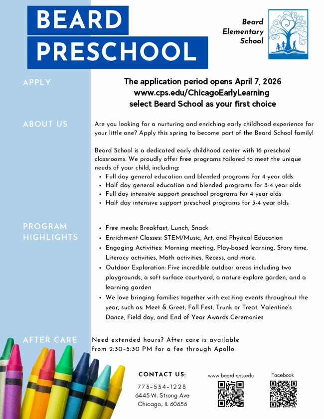 Beard School is committed to providing a safe and nurturing environment that engages all learners. Students are provided with intensive supports, small group instruction, and rigorous and developmentally appropriate curriculum. At Beard, we set high expectations and make it our goal to work on student successes through differentiation. We encourage all of our families to join us in school sponsored parent engagement opportunities. As we move forward throughout the year, know that your child is being taught by highly qualified and trained staff members. We look forward to your partnership this year and thank you for your involvement.